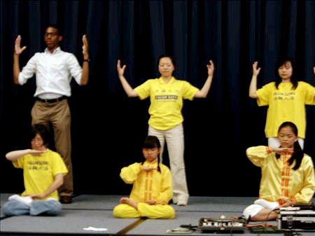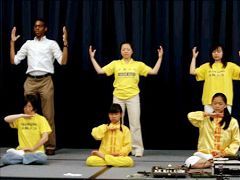 多元文化节于11点正式开始,11位当地法轮功学员应邀参加了这次文化节,一对八岁和11岁的小姊妹,和其他四位法轮功学员上台表演五套功法,另一位学员用英语向空军基地官兵和来宾介绍了这一传播到全球八十多个国家、老少皆宜的佛家修炼大法。