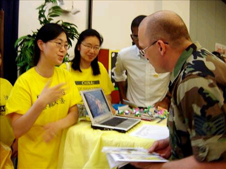 据悉,主办单位是从媒体上得知法轮大法,在了解情况后,决定邀请法轮功作为中国文化代表参加这一活动。空军基地一位军人说,因为工作需要,他们有时会被派到另外一个国家好几个月,了解不同地区的文化、信仰、和地理等对他们很重要,很有帮助。