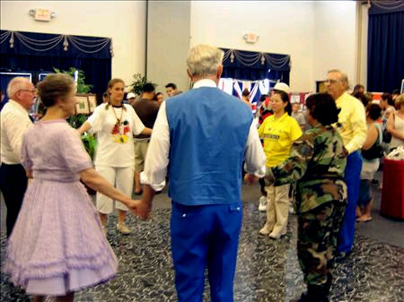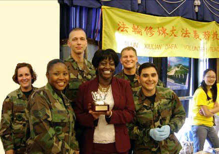 ![]() 不同文化背景的来宾与官兵一起跳方形舞 | ![]() 基地官兵在法轮功展位前合影 |