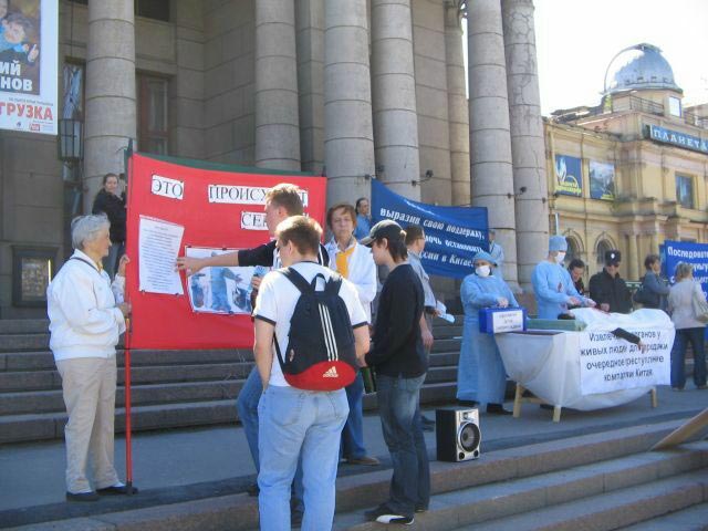 在活动现场,学员们用真人模拟的形式,揭露中共活体摘取法轮功学员器官的罪行。模拟演示、真相展板、真相横幅,一位学员还用扩音器向人们讲述正在中国发生的活体摘取法轮功学员器官的罪恶事实,整个场面,触目惊心。两条大字横幅提醒着人们:“在中国正在发生着活体摘取法轮功学员器官贩卖的罪恶”,“每一个人都应该帮助制止这种犯罪”。