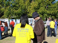 一位坐在轮椅上的老年妇人看了学员的表演后,感慨的说:“看了你们的表演,我内心深感触动,今天真是没白来。”她还强调说:“我已签名支持法轮功,希望你们成功。”