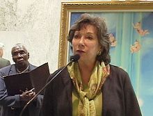 ![]() 人们观赏画作并了解真相 | ![]() 莱克琳女士介绍法轮大法及画作 |
