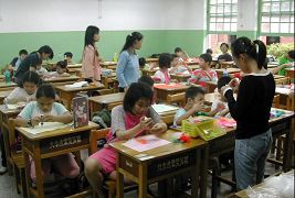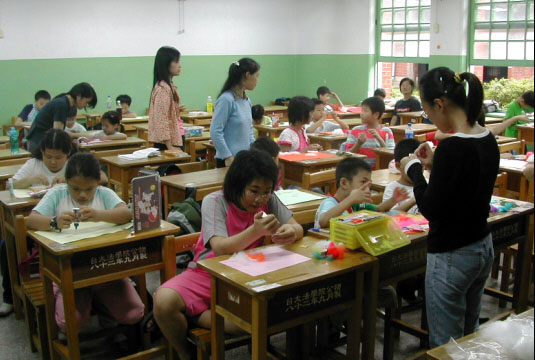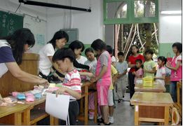 ![]() 小弟子们排队选取自己需要的劳作材料 | ![]() 家长们一起协助着专心创作的小弟子 |