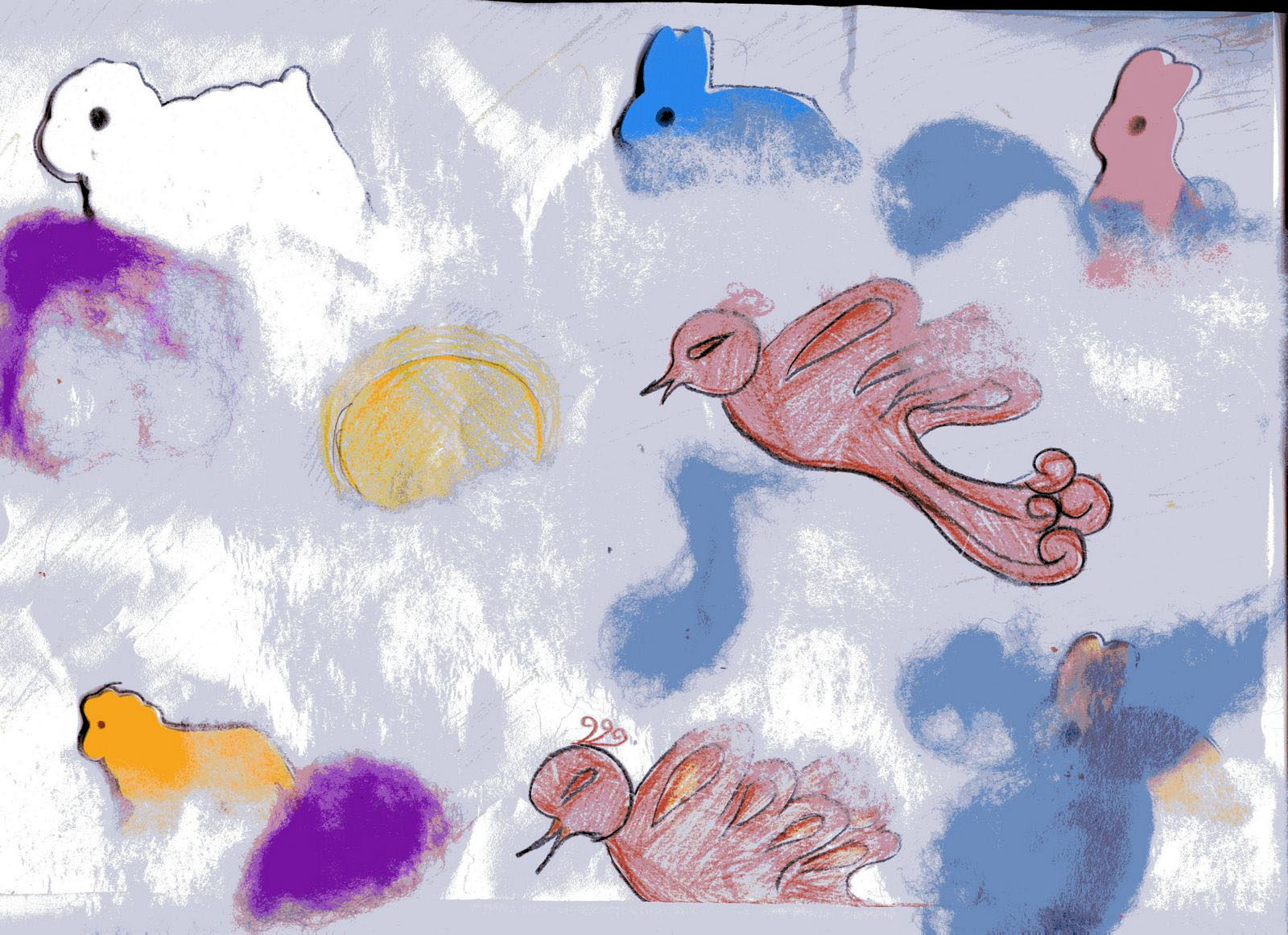 钰涵还未入学,她愿望中的天国世界是师父每天跟钰涵和妈妈一起炼功,里面有许多的兔子、羊……还有七彩的鱼在池塘里游泳……小动物很好奇,也不知道我们在做什么,可是它们很乖也不会来打扰大家。