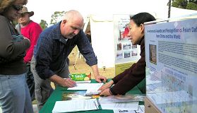很多人来到法轮功学员的摊位签名,拿资料。一位年纪较大的妇女看到学员手拿着谴责中共迫害法轮功的征签表说,我一整天都想着要签名。