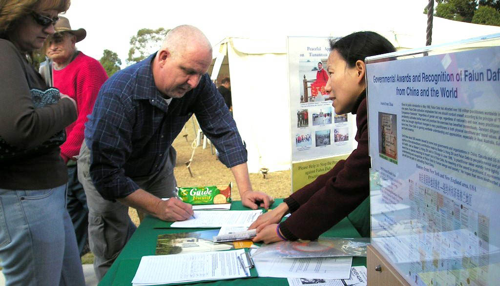 活动过程中,人们都很认真的听学员们讲真相。展板也引起了强烈的震撼,人们不敢相信这样残酷的迫害还在进行着,一位妇女仔细的阅读了所有的图片说明,流着泪不断问着:“为什么这样的事情我以前没有听说过?我真希望澳洲能够为他们(指在中国被迫害的法轮功学员)做些什么。”很多善良的民众听说中共集中营活体盗取法轮功学员器官的暴行,不但自己签名谴责迫害,还拿传单回去给亲朋好友签名,并表示一定要写信给总理。
