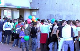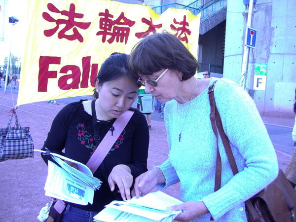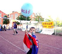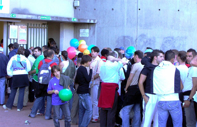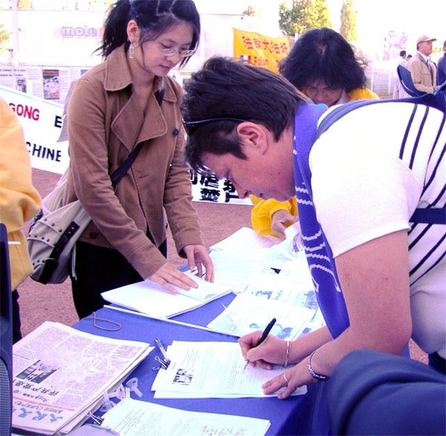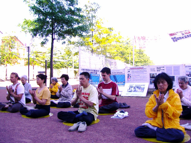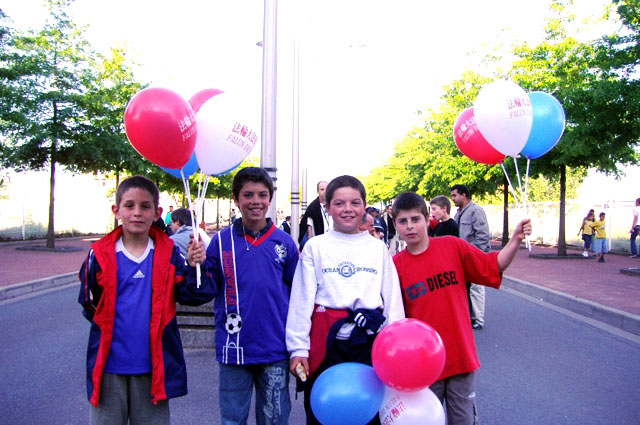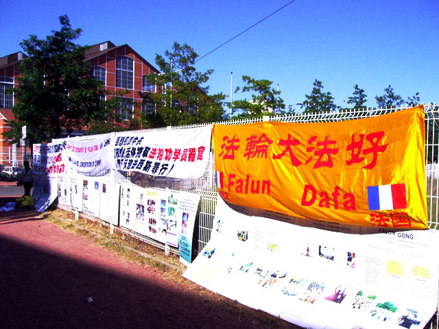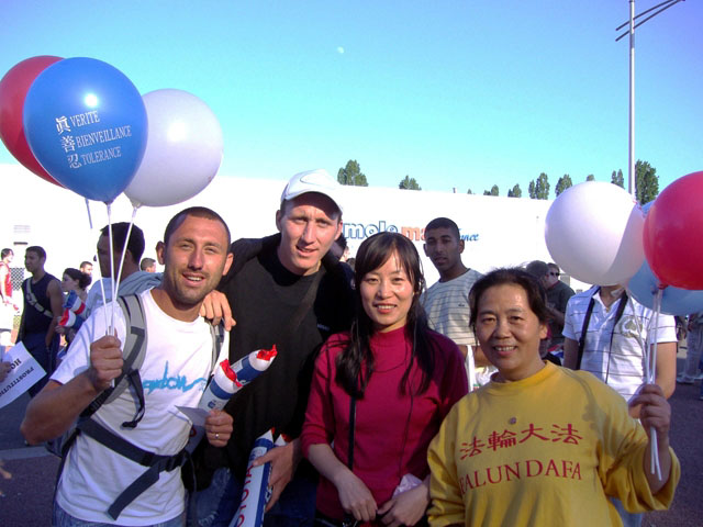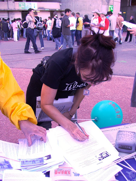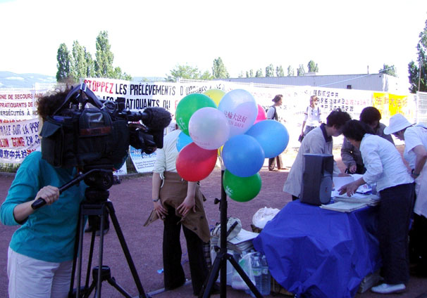 【明慧网2006年6月9日】在二零零六年世界杯足球赛举行之际, 6月7日晚上8点,法国队与中国队在法国中部城市圣•埃田(Saint Etienne)的基奥弗洛依•圭沙(Geoffroy- Guichard)体育场举行世界杯前的友谊赛。法国法轮功学员也到球赛现场,揭露中共7年来对法轮功学员的。他们摆放了揭露中共迫害法轮功的真相图板、悬挂横幅,用高音喇叭向人们揭露中共在劳教所、集中营对法轮功学员的虐杀及活体摘取人体器官的罪行。法轮功学员做的“法轮大法好”、“世界需要真善忍”的五彩气球受到法国人的喜爱,他们觉得这是给他们带来好运的标志。了解了真相的人们纷纷签名支持法轮功,抗议中共暴政。法国电视3台也到现场拍摄并采访了法轮功学员。