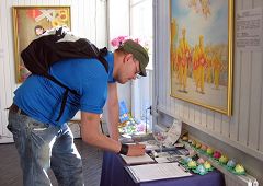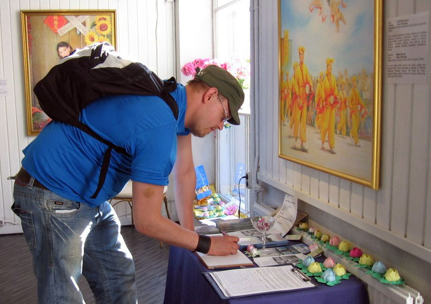 一位芬兰女士上午途经画廊门前时接了学员递上的画展传单,下午有空来参观。认真的看了全部画作后,她对讲解的学员说:我非常感谢给我传单的女士,让我有机会欣赏了这么好的作品,也让我了解了法轮功并明白了迫害真相。然后她在声援反迫害的征签表上签名。