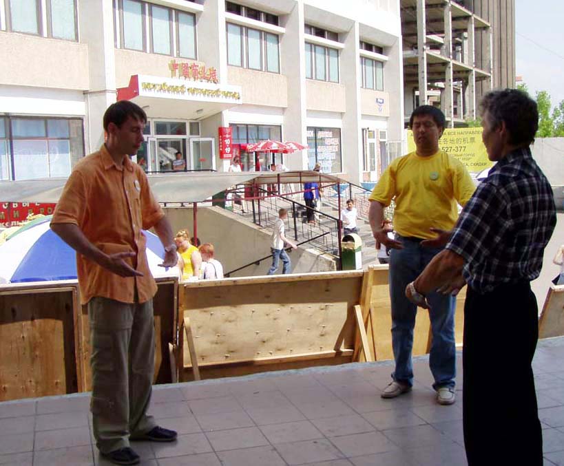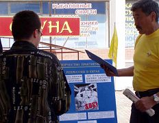 【明慧网2006年7月1日】2006年6月26日,俄罗斯中部城市克拉斯诺亚尔斯克(Krasnoyarsk)市法轮功学员,在本市最大的中国城附近举行活动,揭露中共七年来对法轮功的残酷,向人们介绍法轮大法洪传世界80多个国家的盛况,把法轮大法的美好带给这里的人们。