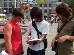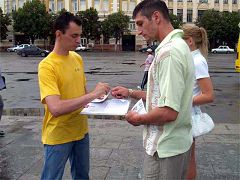 ![]() 人们纷纷签名要求乌克兰政府支持调查中共监狱、劳教所对法轮功学员活摘器官的罪行 | ![]() 排队签名的年轻人 |