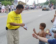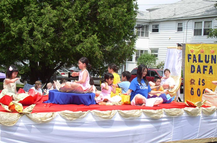 当天有近三万观众沿途观看了游行。一路上,仙女们在“法轮大法好”的音乐中翩翩起舞,用扇子组成各种造型。精美的花车上开放着学员自作的大莲花,每一朵莲花里坐着一位小弟子。