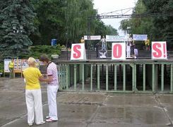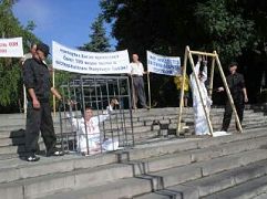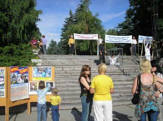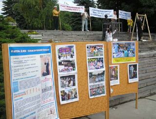 来自高加索矿泉疗养区各城市的法轮功学员参加了这次集会。集会现场摆放着揭露中共酷刑折磨法轮功学员的真相展板,一位被铐在笼子里的学员向人们模拟演示中共的酷刑,过往行人无不感到震惊,纷纷在声援反迫害的签名簿上留下自己的名字。