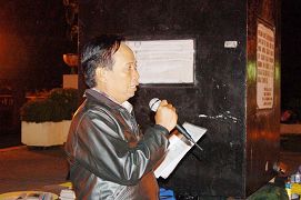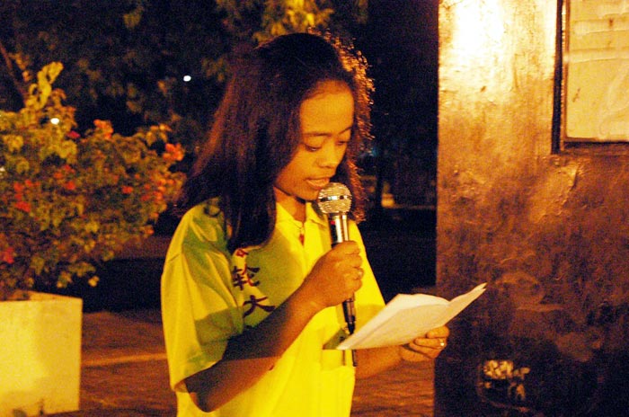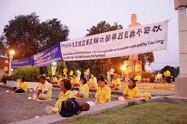 7月8日下午,泗水地区,包括泗水市及东爪哇省附近各县的法轮功学员们,聚集在市内东爪哇省长办公室对面公园内,开始悼念活动。这个公园位于泗水最热闹地区,面临车水马龙的马路,来往车辆很多,醒目的横幅及学员们黄色的炼功服吸引了来往车辆和行人的注目。四点半,炼功音乐响起,五点半,黄昏夜色中点亮的烛光,形成一片肃穆的气氛。接下来的诗歌朗诵、发言、歌曲演唱等表达了学员们悼念大陆同修和坚持不懈反迫害的心声。