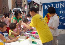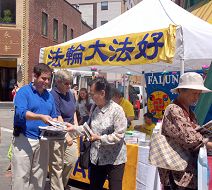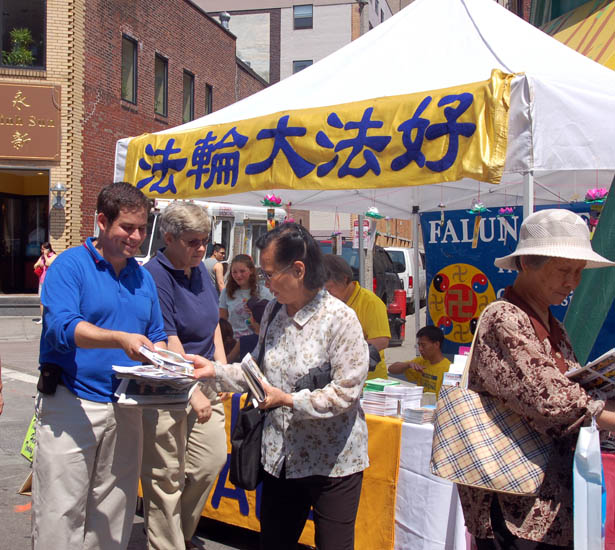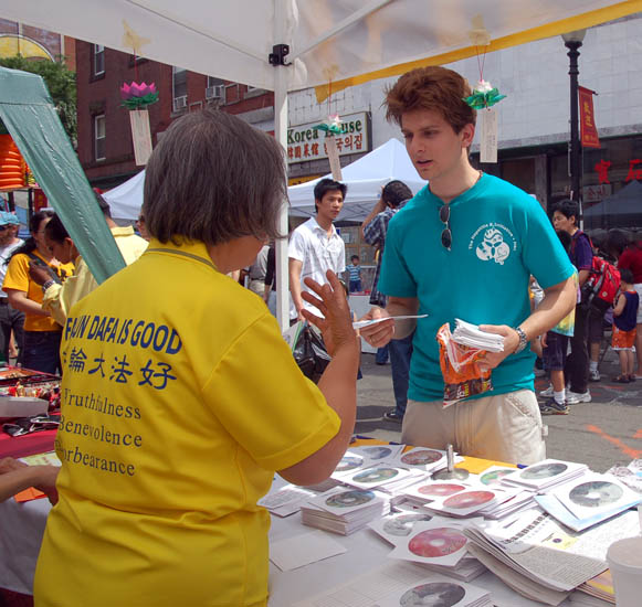 在摊位旁,可以看到西方学员用生疏的华语普通话向中国人讲真相、发资料;而华人老学员亦不畏语言障碍,以手势及简单英语向美国人讲真相。学员们感到接资料的中国人不仅比以往多,还有不少人主动到摊位上自己取。有的将每种资料都拿一份,生怕漏了一点,表示回家要好好看个明白。