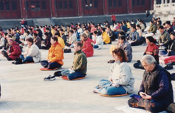 “那年,我们到北京的第一天正好是圣诞日,在文化宫我们和小朋友们一起炼功。以后的几天里,清晨我们和北京学员一起在公园或者在长安街炼功。其余的时间看师父讲法录像和请北京学员到我们住的旅馆里来交流修炼体会。其实,往年我们都是去学员家里交流的,然而在98年底,北京的气氛已经相当紧张了(之前已经出现了96年的光明日报事件,和98年的北京电视台事件等中共政法委操纵下的对法轮大法的诽谤事件)。为了不给当地学员添麻烦,我们就请他们到旅馆里来。”王女士回忆道。
