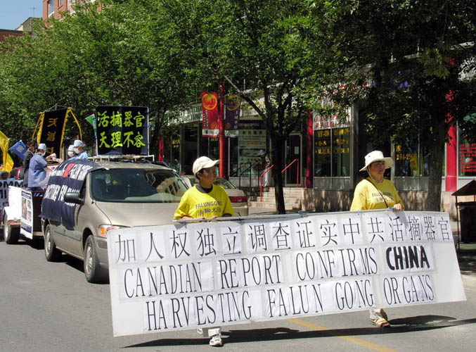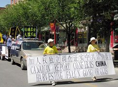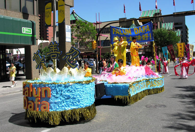 7月8日上午,百多名法轮功学员在加拿大石油重镇卡尔加里的中国城举行游行,腰鼓队雄壮的鼓点、色彩斑斓的花车、翩翩的带子舞和扇子舞、功法表演以及“法轮大法好”乐曲等,向人们展示了法轮功的美好。同时,学员们也通过横幅和标语,向人们诉说法轮功在中国遭受的残酷迫害,尤其是活摘器官模拟车和“活摘器官 天理不容”、“加人权独立调查证实中共活摘器官”等横幅,更是让人们触目惊心。
