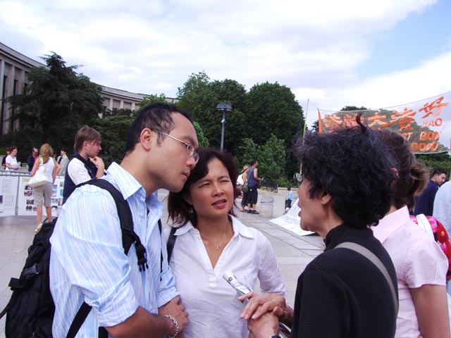 在巴黎工作的Maggy女士与从香港前来看望她的弟弟埃迪,来到巴黎人权广场时,看到法轮功学员模拟中共活摘器官的场景和那些揭露中共迫害法轮功的真相展板后,非常震惊,他们向学员询问迫害缘由,并希望了解更多详情。