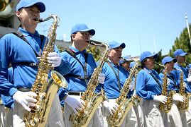![]() 张亮(左一)在美西天国乐团中 | ![]() 张亮(左)在声援中国民众退出中共邪*党-的活动中 |