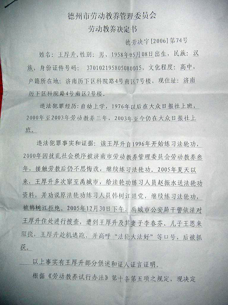 从王厚升被疯狂绑架到禁止家人见面到非法劳教,禹城市公安局、大众日报社的相关恶人、省劳教局、王村劳教所沆瀣一气,不断用谎言罗织罪名,致使《劳教通知书》漏洞百出。大众日报社邪*党-党委书记管义杰至今不敢给家人《劳教通知书》原件,不知其中搞了什么鬼。为了罗织非法劳教的理由,管义杰2006年1月19日曾跑到禹城看守所去诱供,回来说王厚升在12月份回禹城二次;而在2006年2月6日,在家人强烈要求下,管义杰才把《劳教通知书》复印件给了家人。