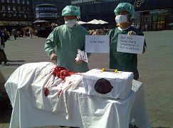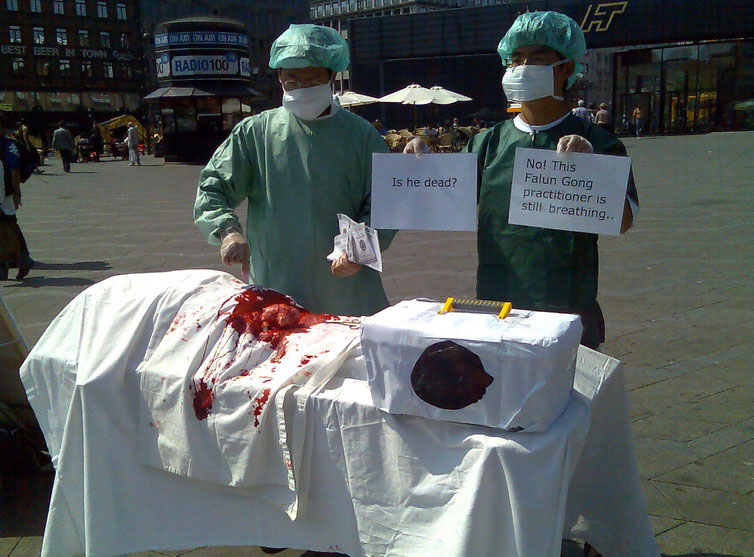 今天揭露中共活摘法轮功学员人体器官的模拟展示,是由彦妮与米凯两位学员义务协调。由于化妆等准备工作做的好,展示效果逼真而醒目,很快就吸引了大量的过往行人前来了解真相。残酷的迫害事实震惊了许多生活在自由世界里、享受着和平生活的人们。