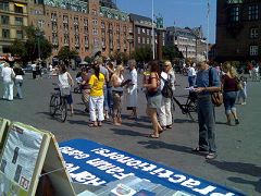 下午,法轮功学员们在哥本哈根最热闹的市政厅广场,第一次举办揭露中共恶党活体摘取法轮功学员器官的真人模拟展。H姐来的稍稍迟了些,她很快就溶入到讲真相的队伍中。虽然她最近有一些魔难,但当她得知办展讲真相的消息后,还是克服困难来到讲真相的集体中。