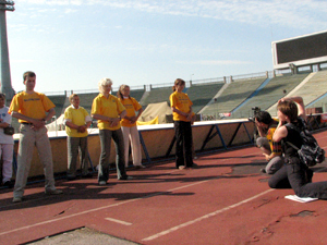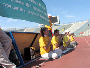 ![]() 法轮功学员在演示功法 | ![]() 法轮功学员在基罗夫体育场抗议中共迫害 |