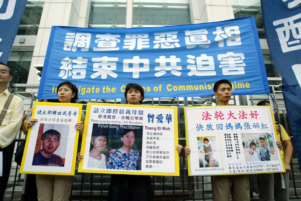 一批被非法关押在中国大陆的法轮功学员的5名亲人陈慕涵、萧文红、梁珍、邝森洽、梁华,也宣读联署声明,要求中共当局立即停止对法轮功学员持续的迫害和关押,并立即释放被非法关押的所有法轮功学员,当中包括他们的亲人。其中陈慕涵在日前刚从澳洲抵达香港,呼吁营救她的母亲、具有香港居民身份的曾爱华。曾爱华被指印刷法轮功资料,于5月下旬在上海被恶警绑架,目前被非法关押在上海浦东新区看守所,当局不准她与亲人及律师见面。