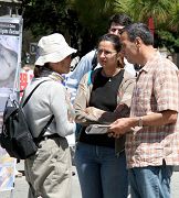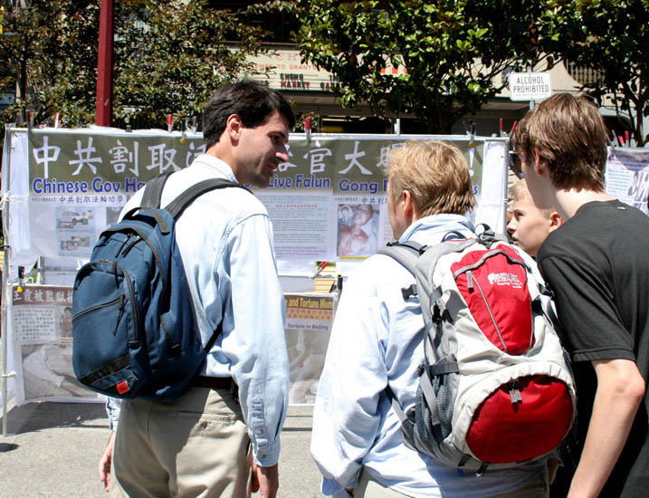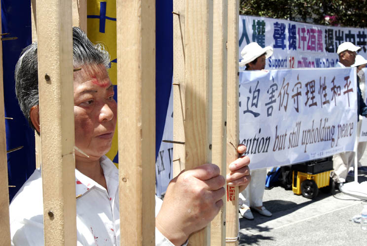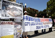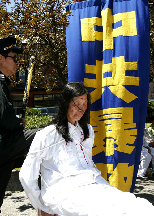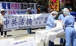 针对中共对法轮功学员长达七年之久的迫害,尤其是最近公布的调查报告指中共确实存在活摘法轮功学员器官的行径,7月15日中午,法轮功学员在旧金山中国城花园角广场抗议中共的迫害,现场并有真人演示中共的暴行及酷刑,以及真相图片展板。一些来到旧金山的游客和当地市民看到中共的暴行后,表示共产党就是不把人当人看。