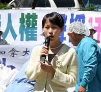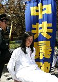 张雪容说,一直以来法轮功学员都用非暴力的方式,上访,申诉等呼吁停止迫害。当我们看到中共用如此残暴的手段对待中国的同胞,我们不能容忍让这种罪恶继续延续。我们也看到了,至今为止,已经有1千2百万的中国人声明退出中共,因为它是如此残忍,竟然以出售我们中国同胞的器官来牟取暴利。