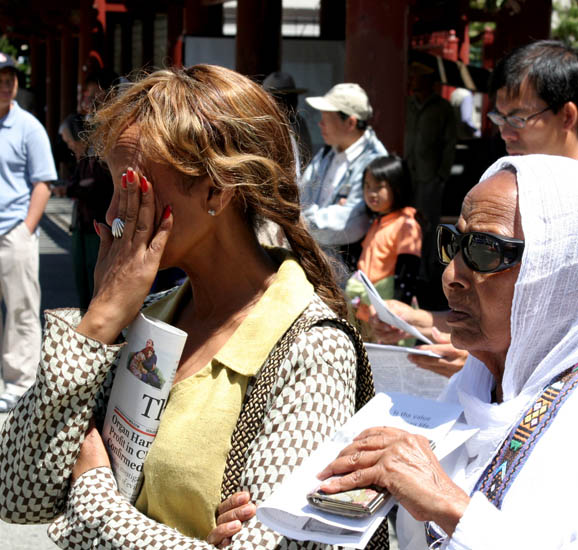 一对黑人母女俩看到现场真人演示的法轮功学员受到迫害的酷刑和活摘器官的场面,女儿MATINA当场流下了眼泪。MATINA说:共产党不把人命当回事,这是在共产党国家普遍存在的。