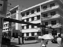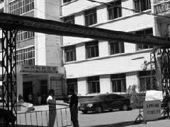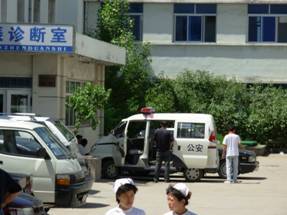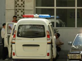 ![]() 2006年7月14日中午,正在施行肾移植手术的泌尿外科病房楼口对面停放的公安车及便衣。 |