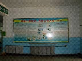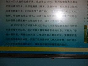 ![]() 外科病房走廊悬挂着泌尿外科肾移植成果展版。 | ![]() 局部展版图片的第二自然段介绍:自2002年5月泌尿外科成功地为2名尿毒症患者施行同种异体肾移植手术以来,现已挽救大量尿毒症患者的生命。 |