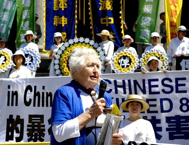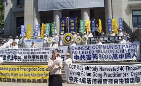 前国会议员及30年资深记者西玛‧郝特(Simma Holt)首先在集会上发言,她一再表示感谢法轮功学员,表示法轮功学员是在为今天我们所有自由的人们在说话,当杀戮人类的罪恶正在进行,没有谁是安全的。(中共)对法轮功学员的迫害与活体摘取器官是新时代的群体灭绝罪。作为记者,她强烈呼吁媒体起正面作用,揭露邪恶。