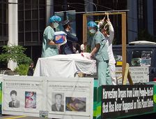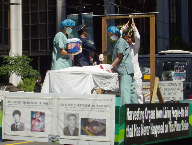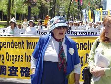 ![]() 西玛‧郝特在游行队伍中 | ![]() 模拟演示揭露中共活摘器官 | ![]() 观看游行的民众 |