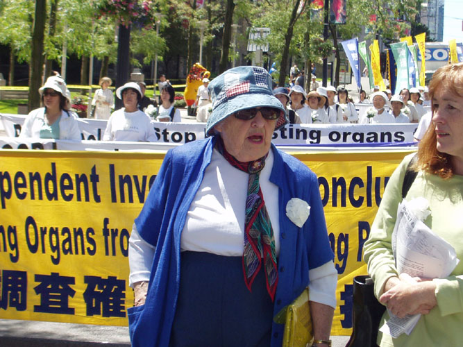 集会结束后,参加者举行了大游行,从市中心一路游行到唐人街,游行队伍庄严肃穆,法轮功学员一袭白衣白裤,所有游行者胸前戴着小白花。前国会议员西玛‧郝特和卑诗省总工会代表菲莱德‧穆珍全程参加了游行。