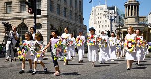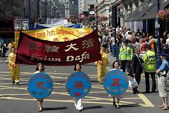 1时许,大游行开始。游行队伍途经伦敦最繁华的购物街、中国城,最后抵达圣马丁广场。游行队伍中,数十位身着白衣的女学员手捧着被中共迫害致死的中国法轮功学员遗像,庄严肃穆;二十多面横幅和展板向街道两旁观看的人们传递着法轮功“真、善、忍”的信息,揭露着中共迫害法轮功学员的罪行。许多匆匆而行的人们看到横幅和展板上中国学员受酷刑、迫害的图证后,露出震惊又严肃的表情,立刻向分发真相传单的法轮功学员索要传单阅读。