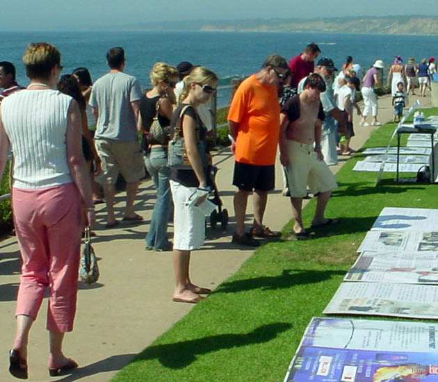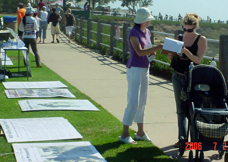 有一位医生详细了解了法轮功,他表示很有兴趣进一步去学。当学员提到超过千万中国人退出中共这个危害世界的邪灵时,他感谢并祝贺学员们。也有一些人开始不愿接传单,当看过一些图片后被事实所震惊,默默地走回来签名。有的人不但自己签名,还告诉家人和朋友来签名。