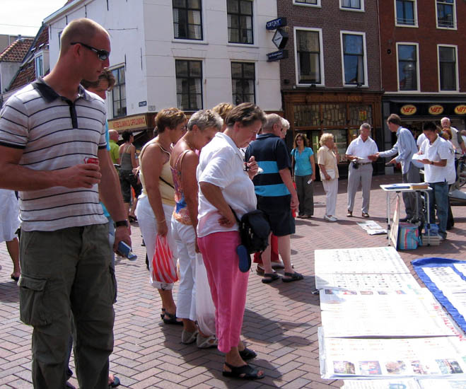2006年7月17日,荷兰法轮功学员来到莱顿的市中心,举办图片展,发放揭露中共残酷迫害法轮功学员的真相资料,向当地民众曝光中共活摘法轮功学员器官的罪恶,呼吁人们帮助制止发生在中国对法轮功的迫害。