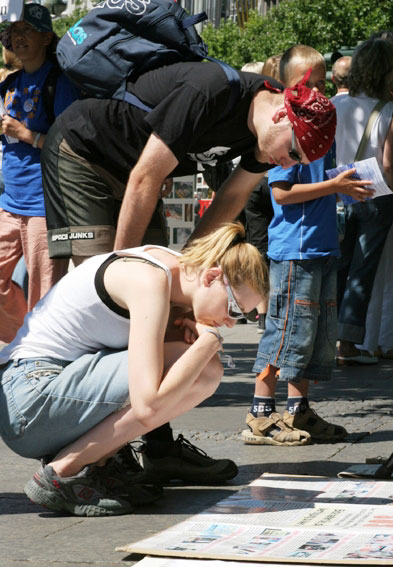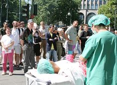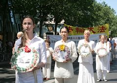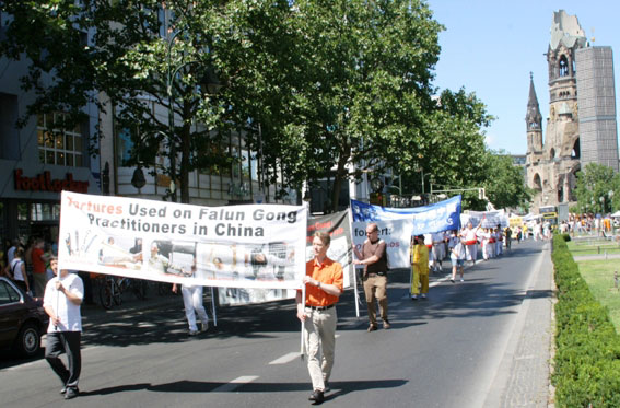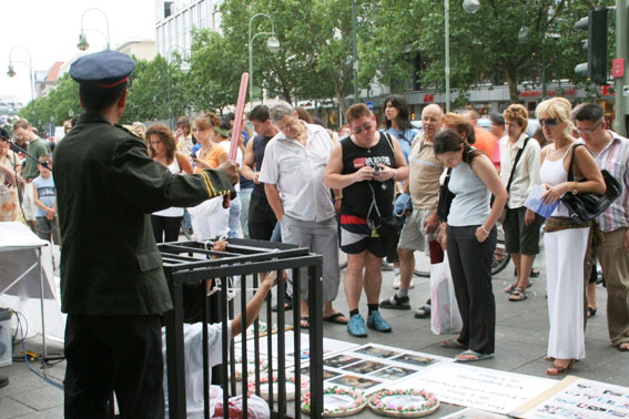 【明慧网2006年7月19日】2006年7月15日,德国法轮功学员在首都柏林举行集会游行,以模拟展示揭露中共对法轮功的残酷,征集反迫害的签名,抗议中共摘卖法轮功学员器官的暴行,呼吁德国政府及国际社会伸出援手,共同制止中共长达7年之久对法轮功的迫害。