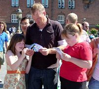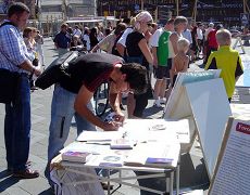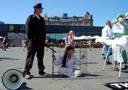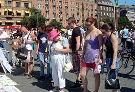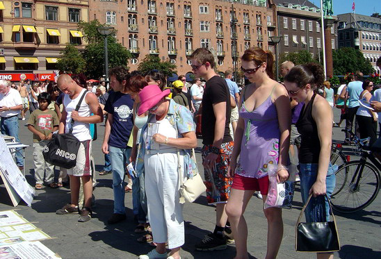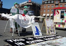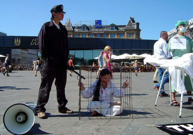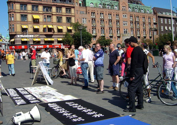 2006年7月16日下午,丹麦及部份瑞典大法弟子再次在丹麦首都哥本哈根市政厅广场,举办真人演示中共活体摘取法轮功学员人体器官及反迫害酷刑展。居住在丹麦其他城市的弟子,也专程驱车来参加这次活动。瑞典邻近的几个城市也有部份学员来参加此次活动。