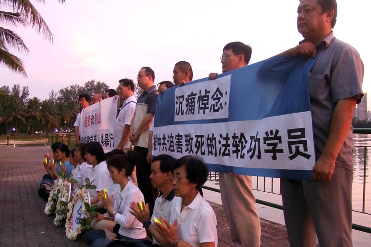 晚间的追悼仪式在河边举行。学员们手持花圈和横幅,心情十分沉重。新加坡大法弟子对于因为坚持信仰而被迫害致死的大陆同修献上哀思和敬意,并呼吁新加坡人民、全世界的政府和民众,汇集他们的良知正念,大家一起来制止这场迫害。