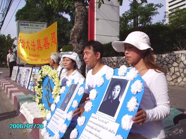 7月20日下午四点多,泰国法轮功学员身穿白衣,手捧被迫害致死的同修的花圈遗照,到中使馆对面打开了“7.20反迫害七年 公道自在人心”、“加拿大独立调查团确证中共活摘器官”等横幅、展板,呼吁人们起来共同制止发生在中国的迫害。