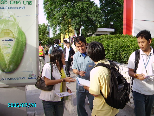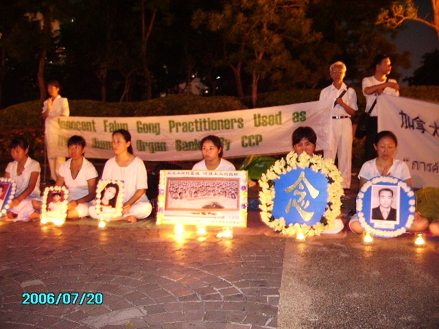 晚上六点多,泰国学员来到皇后公园举行烛光守夜,悼念在中国被迫害致死的同修,抗议中共七年来对信仰“真、善、忍”的法轮功学员犯下的滔天罪行。许多行人在摇曳的烛光和展板前伫立观看,听学员讲真相。