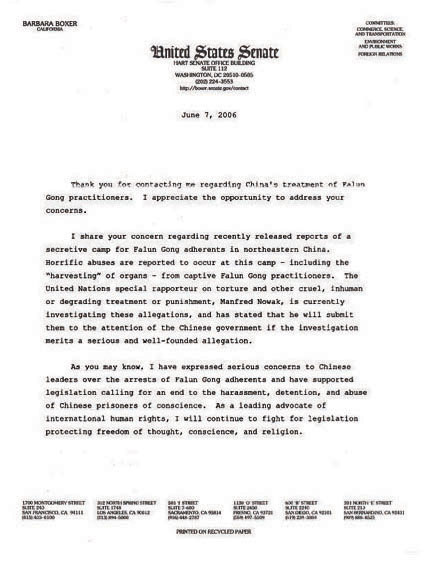 芭芭拉在6月7日的信中说,感谢您就中共对法轮功学员的虐待致信于我。我很高兴有机会对您所关注的事件表达我的看法。