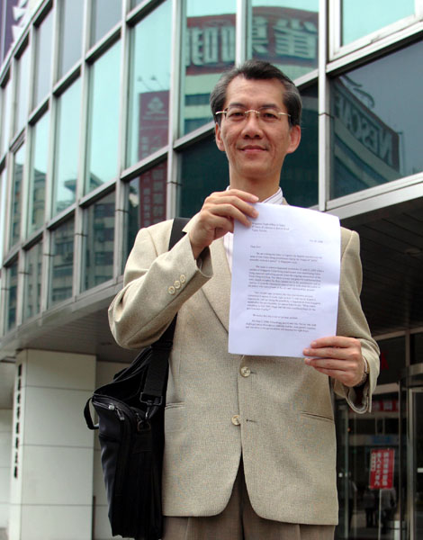 ![]() 明居正向新加坡驻台办事处递交抗议信 | ![]() 明教授与王凤兰律师接受媒体采访 |