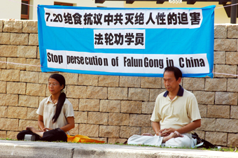 7月20日上午10点45分,新加坡法轮功学员黄才华、余文忠陆续抵达中国驻新加坡大使馆前,挂上写有“7.20绝食抗议中共灭绝人性的迫害法轮功学员/Stop Persecution of Falun Gong in China” 的横幅后,两人在横幅前静坐。