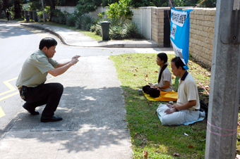 在静坐的过程中,中使馆的一工作人员强行近距离不停地拍照两位学员。新加坡另一法轮功学员陈佩玉稍后于11点左右加入其中。11点20分许,新加坡警方出动2辆警车,强行将三位学员押上警车带到警局,其中72岁的老人陈佩玉是被警方人员强行抱上警车。