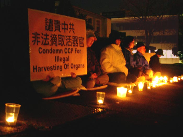 【明慧网2006年7月22日】2006年7月20日,新西兰奥克兰法轮功学员来到中领馆前,在寒夜中点起了一支支蜡烛,伴着烛光炼功、发正念,悼念那些在过去七年中被中共