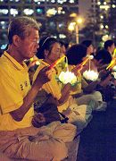 晚上7点,为悼念被迫害致死的法轮功学员举办“正念良知 照耀寰宇”烛光悼念会,超过1200位的学员及民众到场参加。