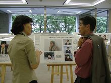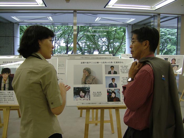 ![]() 日本国会前讲真相 | ![]() 中国人权侵害图片绘画展上法轮功学员向参观者讲解 |